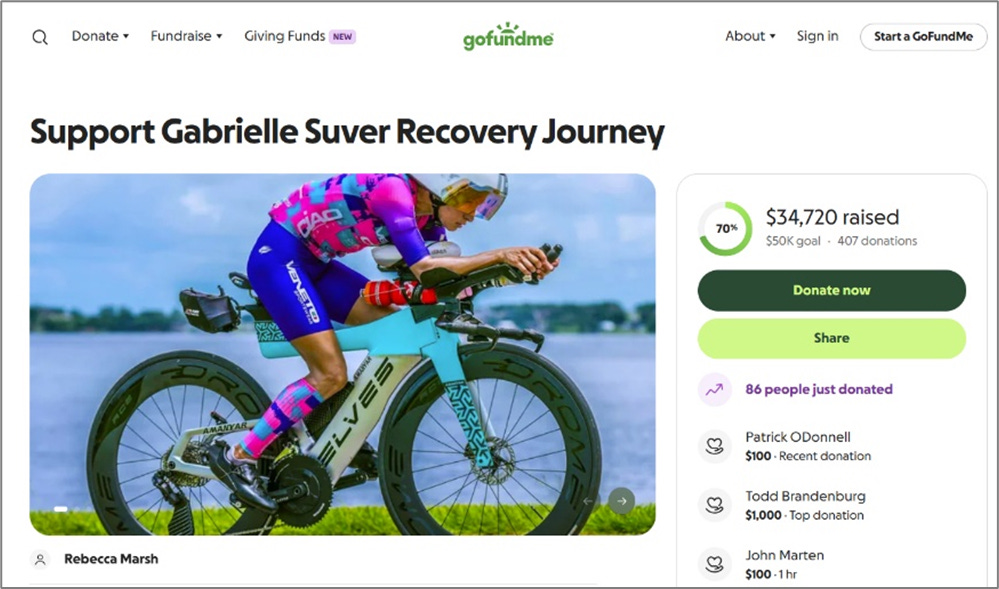 Just this past week Gabrielle Suver, a beloved member of their club, was on her tri-bike and was severely injured in a hit and run accident on a country state road just north of Clermont, FL. Likely it was a driver, driving distracted. Gratefully some good Samaritans saw her by the side of the road and called 911 and provided comfort while waiting for emergency help to arrive. The most recent word was that she will survive. However, the road to recovery will be long. The Club has set up a GoFundMe page to help Gabrielle cover some of her medical expenses, not covered by insurance.